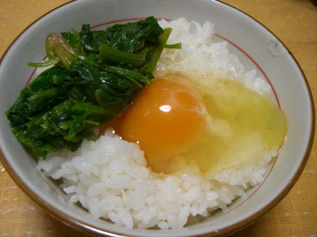 2009-03-11 卵かけごはん13/ほうれん草おひたし 男めし #レシピ 013 ほうれん草おひたし たまごかけごはん 参考『365日たまごかけごはんの本』掲載なし ぱーばばばばっばばー(ポパイの音楽) おいしさ GOOD お手軽さ 普通