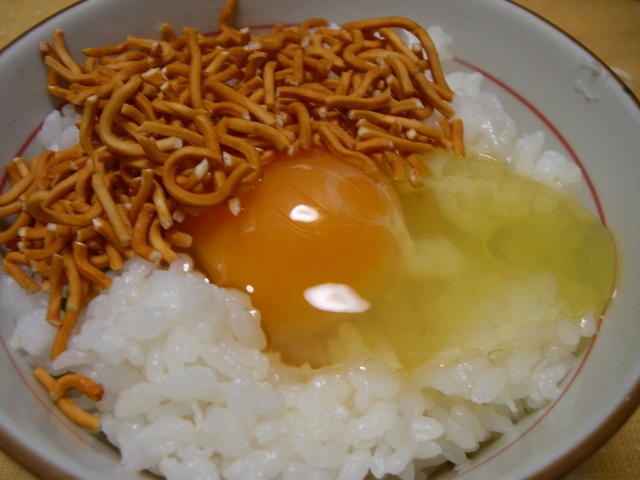 2009-03-15 卵かけごはん14/おかし(ベビースターラーメン) 男めし #レシピ 014 おかし(ベビースターラーメン) たまごかけごはん 参考『365日たまごかけごはんの本』122掲載 一見ミスマッチ!? ところが卵と混ぜあうと意外な食感 試してみる価値はありますよ おいしさ 普通 お手軽さ 普通
