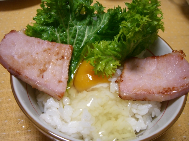 2009-04-05 卵かけごはん17/ハム 男めし #レシピ 017 ハム たまごかけごはん 参考『365日たまごかけごはんの本』掲載なし ハムを少し炒めてトッピング トッピングだけは少し豪華 おいしさ 普通 お手軽さ 普通